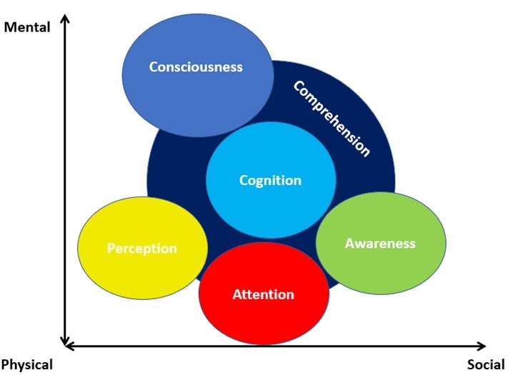 Figure 4: A diagram explaining the mental functions which show that consciousness is only a function of many functions that all partly lie within comprehension. Some parts lie outside of comprehension. In order to make sense of the reality in someone, that person will need to be in a state of mental existence (conscious) as a necessary condition. After that, having knowledge which is highlighted in the middle as cognition. As well, perception of a physical signal highlighted in perception. That person must pay attention to signals to recognize it, highlighted in attention. That person needs to be aware of the signal and what does that signal mean in a social context? Highlighted in awareness. All of these functions make that person able to comprehend the reality to grasp the meaning of things. Sentience is proposed in this paper, to be used as an alternative to what is meant by “consciousness” when these authors mention it (i.e. Danial Dennett and Christof Kock). What these authors speak about is they mean (being sentience), it needs attention, memory (autobiographical and working), perception, consciousness and comprehension. Sentience might need memory, meanwhile consciousness does not. Awareness is an overused word by the public (like awareness of dangers of smoking), so sentience here will be awareness on the diagram.